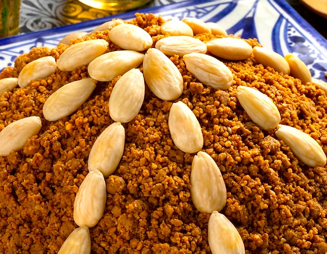 Sellou (Sfouf), a toasted mixture of almonds, sesame seeds, and flour, is commonly served during religious festivals. Its nutty richness and energy-packed ingredients make it ideal for long gatherings and festive occasions.