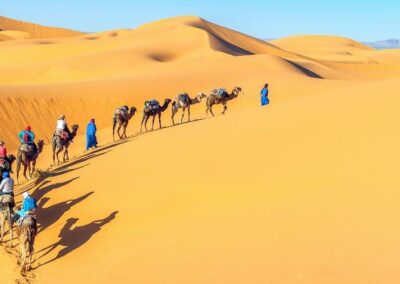 A major highlight of this tour is the adventure into the wild and remote Erg Chegaga dunes, one of Morocco’s most untouched desert regions. Enjoy a camel trek across golden sands, dramatic off-road desert driving, and a peaceful night in a desert camp far from civilization. The journey continues through the stony desert, dried Iriqui Lake, saffron fields of Taliouine, and the fortified city of Taroudant, before ending with relaxation and coastal charm in Essaouira, Morocco’s laid-back Atlantic gem. This tour is ideal for travelers seeking adventure, culture, and diverse landscapes in one unforgettable experience.